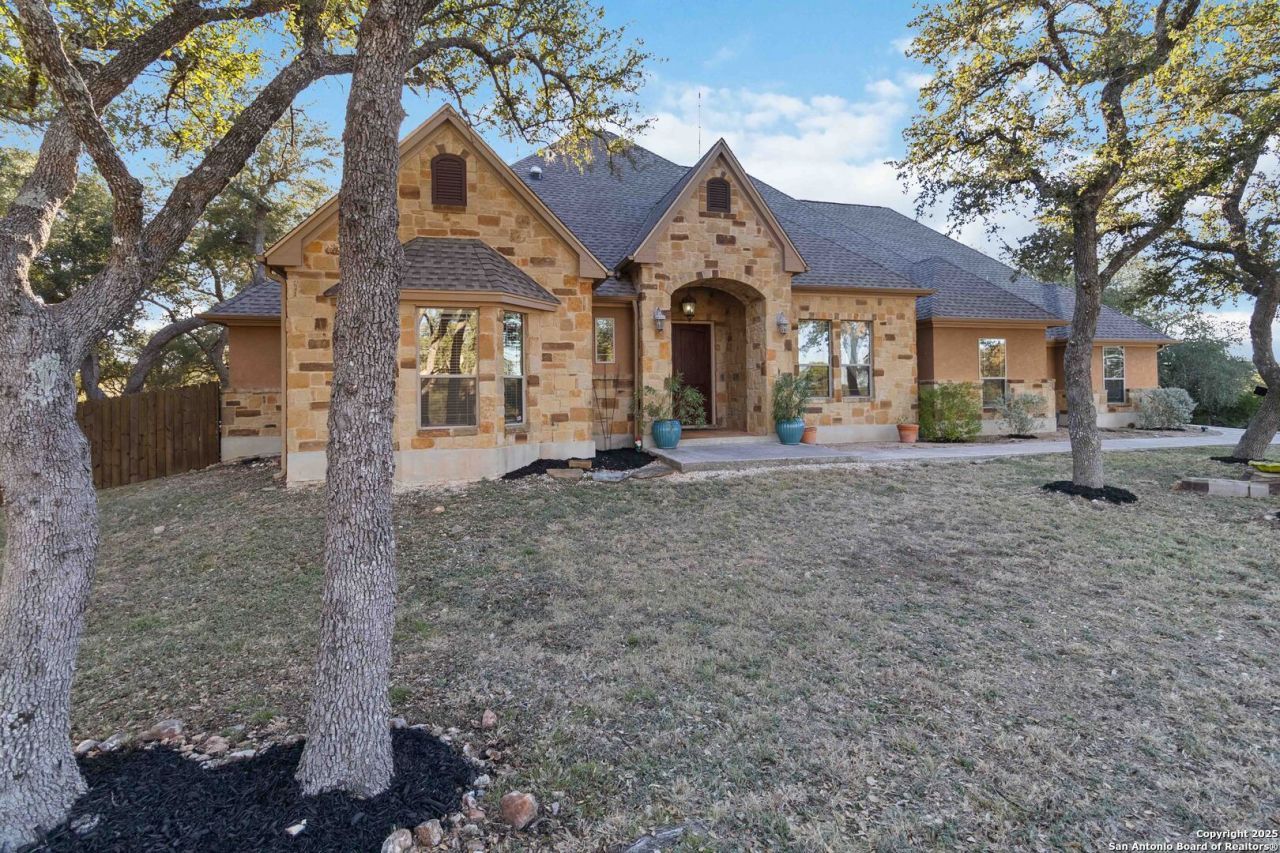 Experience the best of Texas Hill Country living in this exceptional home located in the charming city of New Braunfels. Nestled on a majestic oak-studded corner lot within the highly desirable River Chase community, 129 Legacy Hills offers 3,440 square feet of beautifully crafted living space, including 4 bedrooms, 3.5 baths, a game room, and a 3-car garageA stunning Fredericksburg-style stone exterior welcomes you home. Nearly all living space is located on the main level, with the exception of an expansive upstairs game room-perfect for entertainment, hobbies, or additional living space. Step through the elegant double wood doors to be greeted by a striking combination of solid hardwood flooring and designer travertine tile, all illuminated by a view straight out to the sparkling pool and spa. This custom flooring extends throughout the entire home, enhancing its warm and refined feel. Designed for both comfort and functionality, the smart floorplan includes a lovely formal dining room and a spacious open-concept living area, where the living room, breakfast nook, and kitchen flow seamlessly-ideal for everyday living and holiday gatherings. A beautiful stone fireplace anchors the living room, adding charm and a cozy ambiance. The chefs kitchen impresses with 42" custom cabinetry, a generous work island, and stainless-steel appliances-including a refrigerator-providing both style and efficiency. The primary retreat serves as a luxurious oasis, complete with a massive walk-in closet, dual vanities, a relaxing soaker tub, and a step-in shower. Three additional bedrooms are thoughtfully positioned to offer both convenience and privacy for family or guests. Upstairs, a spacious flex/game room awaits-a versatile bonus area ready to become your media room, playroom, gym, or creative studio. Step outside to your very own Hill Country oasis. The backyard boasts an expansive custom pool and spa, surrounded by natural flagstone decking and framed by mature trees that canopy the entire yard, creating privacy, shade, and an inviting outdoor retreat. Offering timeless design, exceptional craftsmanship, and resort-style amenities, this home embodies comfort and elegance in one of New Braunfels most sought-after communities. Welcome to 129 Legacy Hills-a spectacular Hill Country haven!