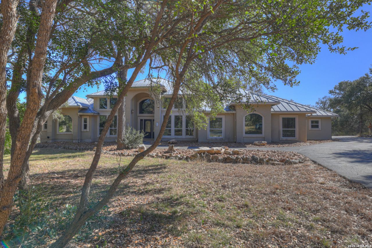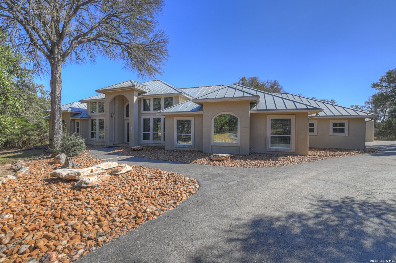 Dont miss this stunning 4-bedroom, 2.5-bath, one-story home situated on 2.68 acres in the highly sought-after River Chase community, tucked away on a quiet cul-de-sac. Offering 3,024 square feet of thoughtfully designed living space, this open-concept home is filled with natural light, with every room enjoying picturesque views of the surrounding land. The spacious living area features stained concrete floors, built-in shelving, and a cozy wood-burning fireplace, all framing the beautiful outdoor scenery. Adjacent flexible spaces can be used as a breakfast room, formal dining area, or additional living space to suit your needs. A convenient half bath provides direct access from the expansive deck overlooking the beautiful land-perfect for indoor-outdoor entertaining. The kitchen boasts granite countertops with bar seating, gas cooking, open sightlines to the living area, and a generous pantry. The private primary suite offers serene greenbelt views from every window and features dual vanities, a claw-foot soaking tub, a separate shower with dual shower heads, large dual closets, and a spacious linen cabinet. Step directly from the primary suite onto a private deck with a hot tub, creating a true retreat. Two additional bedrooms share a Jack-and-Jill bathroom with privacy glass, allowing natural light while maintaining privacy. The attached oversized garage includes stairs to an attic space with potential for future conversion. In addition, a separate garage/shop provides extra vehicle parking, workshop space, and ample storage. This exceptional property offers privacy, versatility, and Hill Country charm-an ideal place to live.