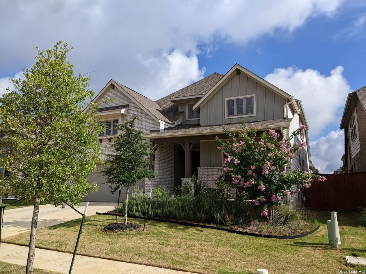 What a gorgeous home! Imagine the photo opps on that beautiful curved staircase. Evenings sitting on the porch or barbeques on the back patio. Flooded with natural light, soaring ceilings, spacious. This home is better than new - the owners barely lived in it as they travel a lot. Large walk-in pantry and master closet. So many upgrades - 3 car garage, built ins upstairs and master closet, custom painted kitchen cabinets, landscaped for easy maintenance and less watering, energy efficient, high end granite countertops, blinds on all the windows, updated mirrors in master bath, high end shelving in garage for extra storage. This home is so adaptable - perfect for all types of situations, just use the downstairs, multi-generational (with the front bed and bath), families of varying sizes. It truly is a must see. Refrigerator conveys. Drapes do not convey.