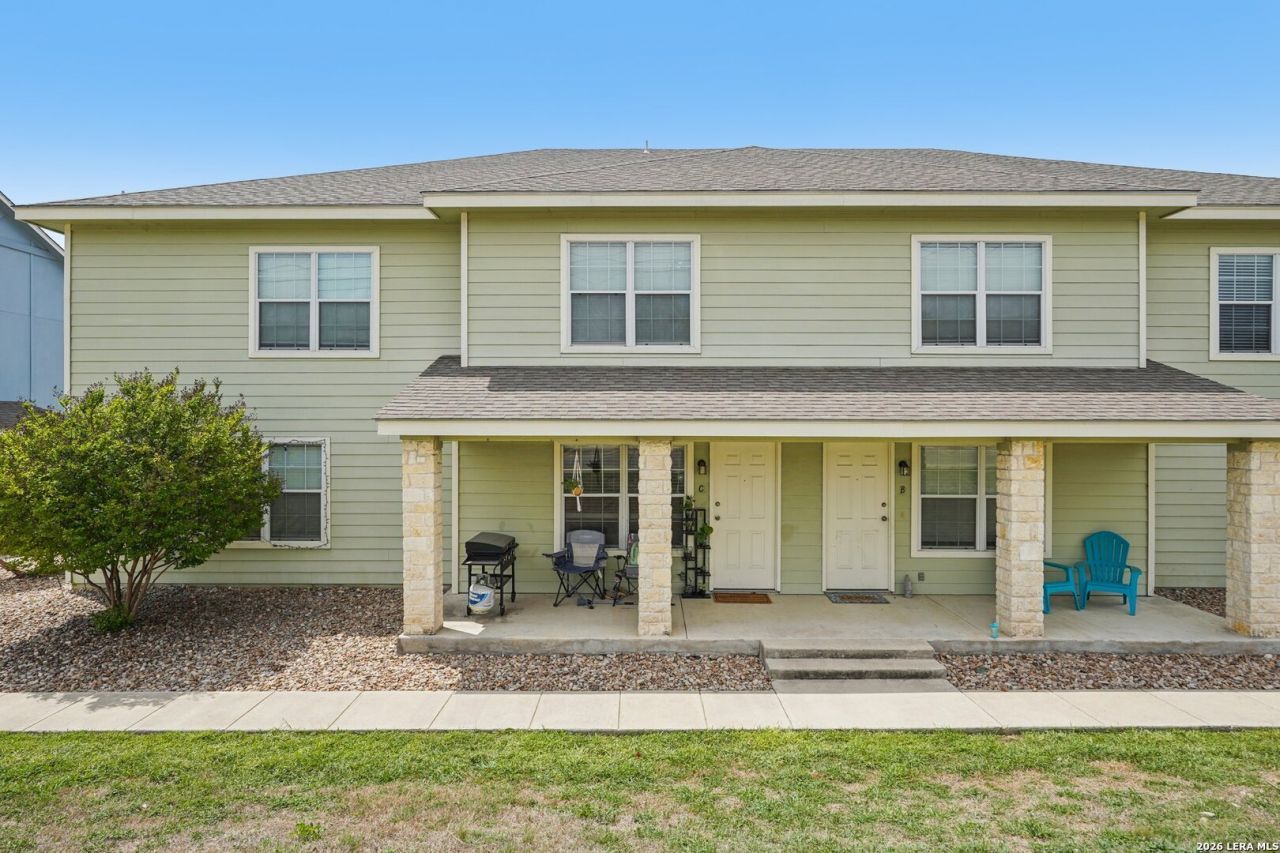 Well-maintained two-story attached townhome offering approximately 1,088 SF with two bedrooms and two bathrooms in a desirable Kerrville location. The open-concept main level features comfortable living, kitchen, and dining spaces with tile flooring, granite countertops, and neutral finishes. A full appliance package conveys including refrigerator, range, built-in microwave, dishwasher, washer, and dryer. The primary suite includes a private bath with dual vanity sinks, while the second bedroom also features its own full bathroom. Exterior features include a covered front porch, rock-veneered columns, HardiBoard siding, composite roof, xeriscaped landscaping, and a one-car attached garage. HOA covers trash, water, sewer, and lawn maintenance for easy living. Conveniently located near parks, walking trails, and the Olympic pool and just minutes from Tom Daniels Elementary School, Hal Peterson Middle School, and Tivy High School. Currently tenant occupied, offering flexibility for investors or future owner-occupants.