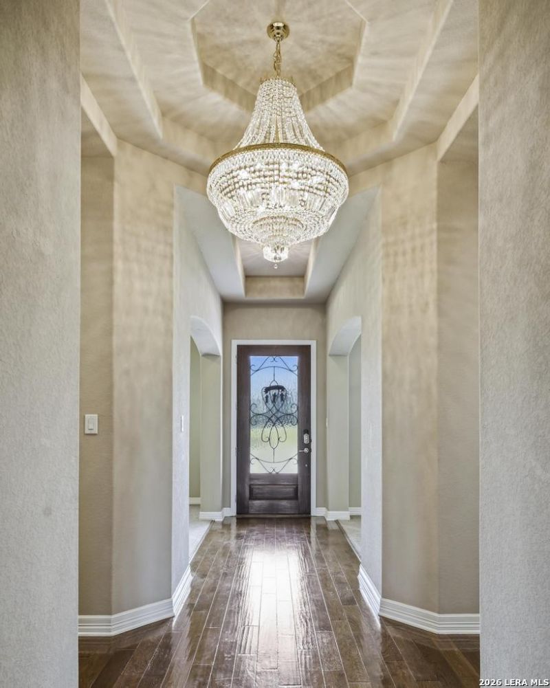 Exquisite custom all-brick one-story estate set on over half an acre, backing to open green space. The grand entry welcomes with soaring ceilings, dual chandeliers, and rich real wood flooring extending into an oversized family room anchored by a corner gas-log fireplace. Designed for both elegant entertaining and comfortable living, the home offers formal dining, a separate living area, powder bath, and a dedicated media room complete with projector, screen, and surround sound. The gourmet island kitchen features stainless steel appliances, a 5-burner gas cooktop with vent hood, built-in oven and microwave, custom cabinetry, a butlers pantry with coffee bar, and a large walk-in pantry. The luxurious primary suite includes dual walk-in closets and a spa-inspired bath with split vanities, a 3-way mirror, garden tub, and walk-in shower with seating. A private guest suite with full bath and two secondary bedrooms connected by a Jack-and-Jill bath provide ideal accommodations. Outdoor living is exceptional with an epoxy-finished covered patio featuring ceiling fan, TV mount, and sunshade, plus a separate pavilion with built-in outdoor kitchen overlooking the expansive green space. Additional features include a storage shed, fire pit, water softener, alarm system, custom 2-inch blinds, ceiling fans throughout, and an oversized side-entry 3-car garage. Located in a quiet gated community just minutes from Hwy 211, shopping, and dining.
