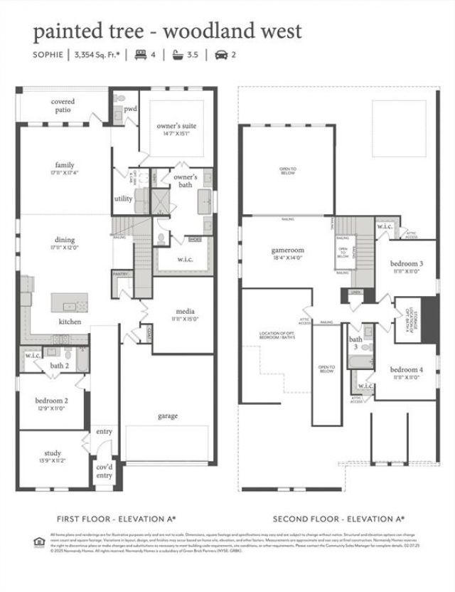 NORMANDY HOMES SOPHIE floor plan. This versatile 4-bedroom, 4.5 bathroom home is designed for modern living. This thoughtfully crafted floor plan includes a dedicated downstairs study, media room, and a guest bedroom with a private ensuite, perfect for visitors. Each bedroom features a walk-in closet, providing ample storage space. The large chef's kitchen is ideal for culinary enthusiasts, while the secluded owner's suite offers a retreat with a freestanding tub and dual vanities. Upstairs, you'll find a spacious game room and two additional bedrooms and 2 full baths. A true favorite of our buyers!