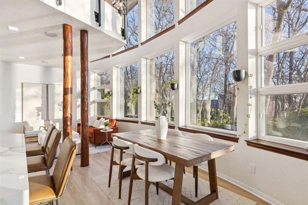 Architecturally distinctive Lake Lewisville waterfront residence situated on a 1.44-acre elevated peninsula in the Emerald Sound community, offering exceptional privacy, panoramic lake views, and direct access to the water. Designed by GGOArchitect Gary Olp, the home reflects a thoughtful integration of passive solar design, sustainable materials, and site-responsive architecture that preserves mature Texas native trees.Expansive south- and east-facing windows with architectural overhangs provide abundant natural light while supporting year-round energy efficiency. Strategically placed north and west openings contribute to balanced interior climate control. Five Andersen double-pane glass door systems connect interior living spaces to gardens, patios, and lake views.The cantilevered primary suite extends toward the shoreline, creating a private retreat with sunset views over the lake. Outdoor living areas include a Rumford fireplace, a sunken stone patio kitchen, and a landscaped spa setting surrounded by drought-tolerant plantings and herb gardens. A constructed pathway leads to the water’s edge with kayak storage and convenient lake access.The exterior features cementitious stucco, ICF construction, and a standing-seam metal roof, offering durability, sound insulation, and thermal performance. The lower level provides additional storage and a temperature-controlled wine cellar. All bathrooms throughout the home have been updated, and the kitchen is enhanced by brand-new appliances, including dual ovens. A second-floor Eagle’s Nest loft features a widow’s watch window.The property includes a four-car garage with a private guest suite offering an ensuite bath, walk-in closet, and light kitchenette designed for beverage and snack preparation. A rare opportunity to own a design-driven, energy-efficient waterfront home in one of Lake Lewisville’s most private and elevated settings.