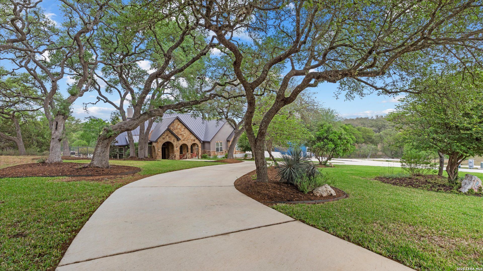 Stunning custom Hill Country estate in the highly sought-after River Chase community, perfectly situated on 2.63 private, oak-studded acres. This beautifully designed single-story home offers 3 bedrooms, 3 full baths, a half bath, and two spacious living areas, including a formal sitting area, across 3,442 square feet of thoughtfully crafted living space. From the moment you arrive, the striking stone exterior, arched entry, and metal roof set the tone for timeless quality and craftsmanship. Inside, warm wood flooring, architectural details, and an inviting stone fireplace create a welcoming yet refined atmosphere. The open-concept layout is ideal for both everyday living and entertaining, with multiple living spaces offering flexibility for gathering, relaxing, or working from home. The well-appointed kitchen features custom cabinetry, granite countertops, and designer finishes. The private primary suite is a true retreat, featuring a dedicated sitting area and a spa-like bath with soaking tub, walk-in shower, and generous closet space. Secondary bedrooms are well-sized with access to beautifully finished baths. Step outside to your own Hill Country oasis-an expansive covered patio overlooking a resort-style pool with water features, surrounded by mature trees and scenic views. Whether hosting guests or enjoying a quiet evening, this outdoor space delivers exceptional privacy and tranquility. A rare and highly desirable feature, the 18x50 detached workshop/RV garage is fully insulated and equipped with electricity and remote access-perfect for a workshop, recreational vehicles, or additional storage. The property also includes an attached garage, offering both convenience and versatility. Located in River Chase, residents enjoy exclusive access to premier amenities including a private Guadalupe River park, clubhouse, fitness center, and scenic walking trails-all just minutes from shopping, dining, and the charm of New Braunfels. A rare opportunity to own a private, amenity-rich estate that combines luxury, functionality, and the best of Hill Country living.