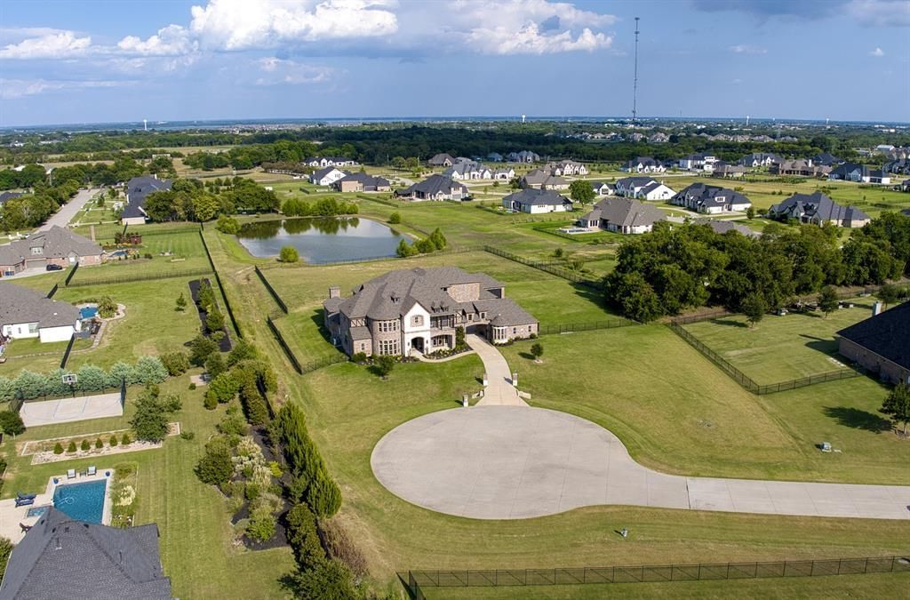 Step into a world of unmatched luxury on 4.48 acres with a private lake in the coveted Stinson Highlands of Lucas, Texas. This 2018 custom estate, perched on the largest lot in the neighborhood and tucked away on a private cul-de-sac, offers nearly 8,000 sq. ft. of exceptional living with 7 bedrooms, 5.5 baths, a 5-car garage, and a state-of-the-art gym. Every detail exudes sophistication, combining modern elegance with warmth and comfort.The main level impresses with soaring ceilings, walls of natural light, and open-concept spaces that seamlessly connect living, dining, and entertaining areas. The chef’s kitchen, featuring premium appliances, custom cabinetry, and a generous central island, is perfect for gourmet meals or hosting unforgettable gatherings. Retreat to the luxurious primary suite with a fireplace, spa-inspired bath, soaking tub, dual vanities, and expansive walk-in closets. A main-level office and guest bedroom add versatility, while the custom gym is a fitness enthusiast’s dream.Upstairs, discover expansive game and media rooms, plus flexible office spaces, ideal for modern family life, remote work, or play. Every corner of this home showcases meticulous craftsmanship and thoughtful design.Outside, the estate’s sprawling grounds are a blank canvas for resort-style living—imagine a pool, outdoor kitchen, lush gardens, or recreational playgrounds, all framed by the serene HOA-maintained lake. Elevated for privacy yet close to top-rated schools, shopping, and dining in Lucas, Allen, and Plano, this estate perfectly balances seclusion and convenience.More than a home, this property is a lifestyle statement—a blend of elegance, comfort, and grandeur, offering endless possibilities for entertaining, relaxing, and living at the highest level. Experience North Texas luxury at its finest in one of the region’s most prestigious communities.